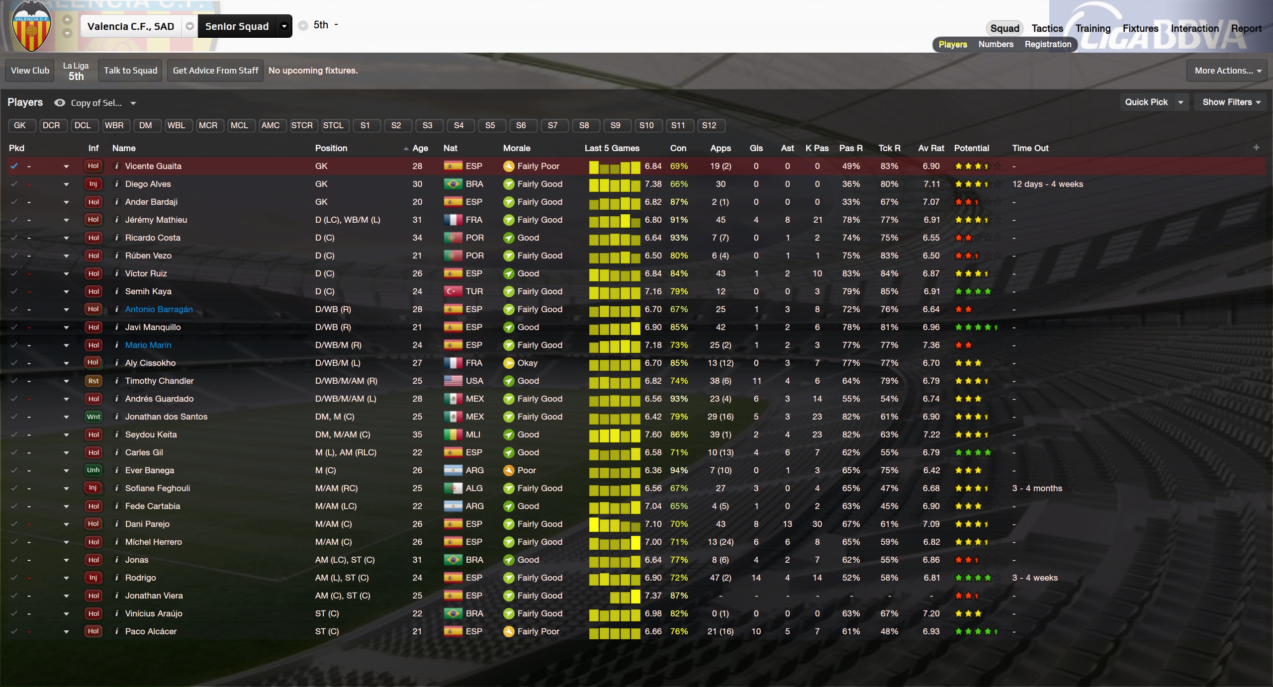 The squad were actually pretty good. The middle of the part, where a lot of my players sit, was strong. Pizzi had signed Rodrigo from Benfica last season which was a good buy in my opinion. Defensively, we have four centre backs, the star of which is Semih Kaya. Not the tallest, but he’s strong and can read the game well. Pizzi also signed Javi Manquillo from Atletico Madrid, whom I rate highly in this game. I’ve had him at a few clubs and turns into a great player. Paco Alcacer is the other star of the show here. He’s going to be my Deep Lying Forward. This role has scored lots of goals for me in my previous seasons, so I expect much from him.