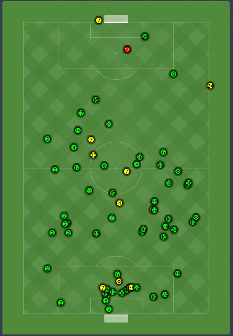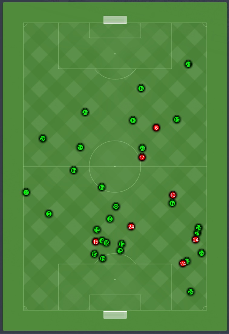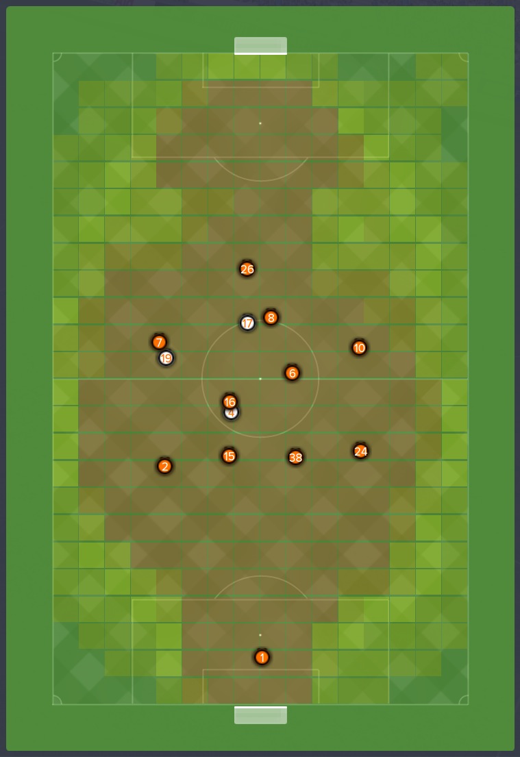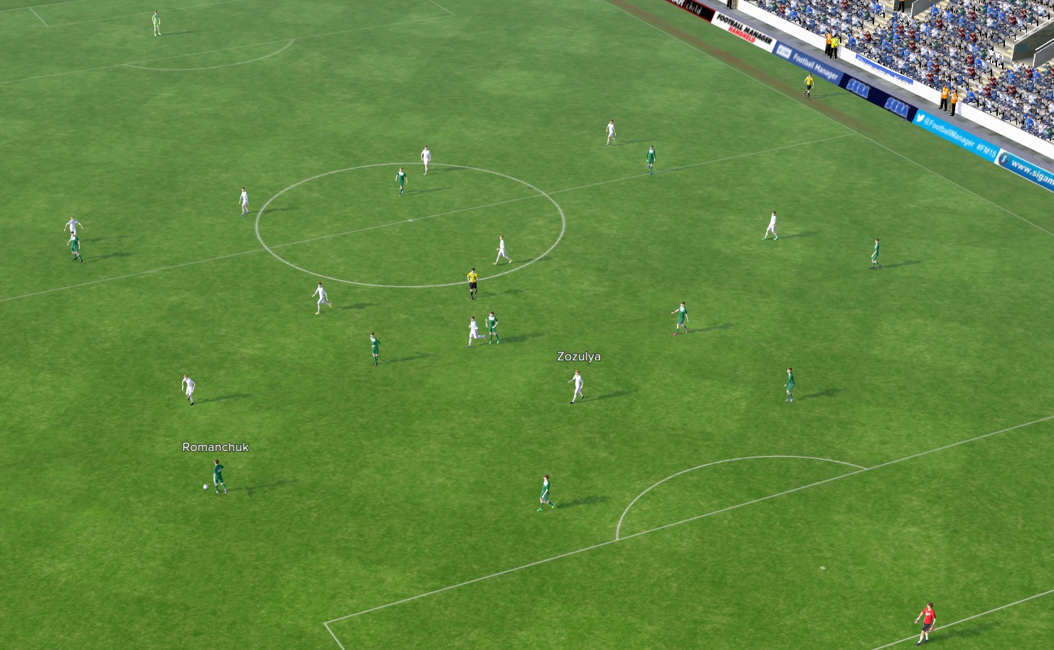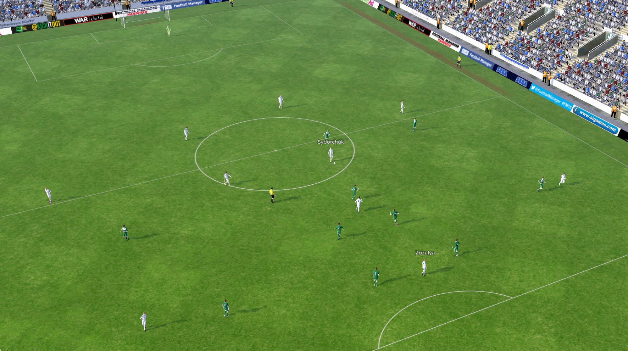 Same angle as before and just seconds after the picture above, we now have possession. We’ve moved into a 4231. The two CB’s are still deep but our FB’s are on the halfway line. Both attacking wide players are running forward.