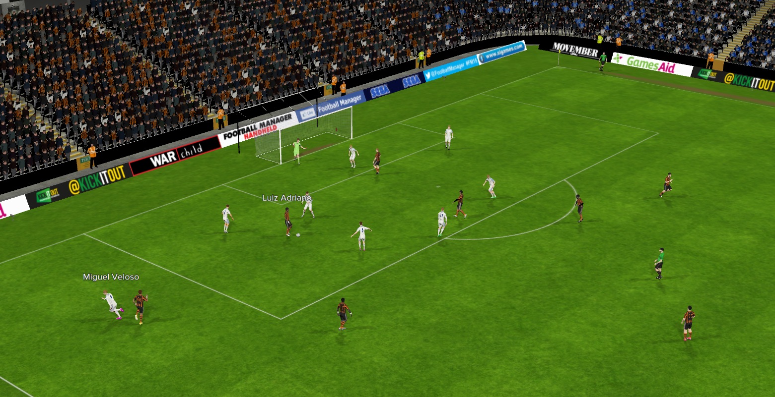 Azevedo is about to cross the ball into Luiz Adriano for the opening goal. The man on Adriano doesn’t do much wrong, he does have his back to the player, but he’s between him and the ball at least. The problem was that the full back stood off of Azevedo. He didn’t put pressure on him. He did do as he was told though, which wasn’t to put pressure on him. Oops! In the end, Adriano ran round the back of my defender and headed home.