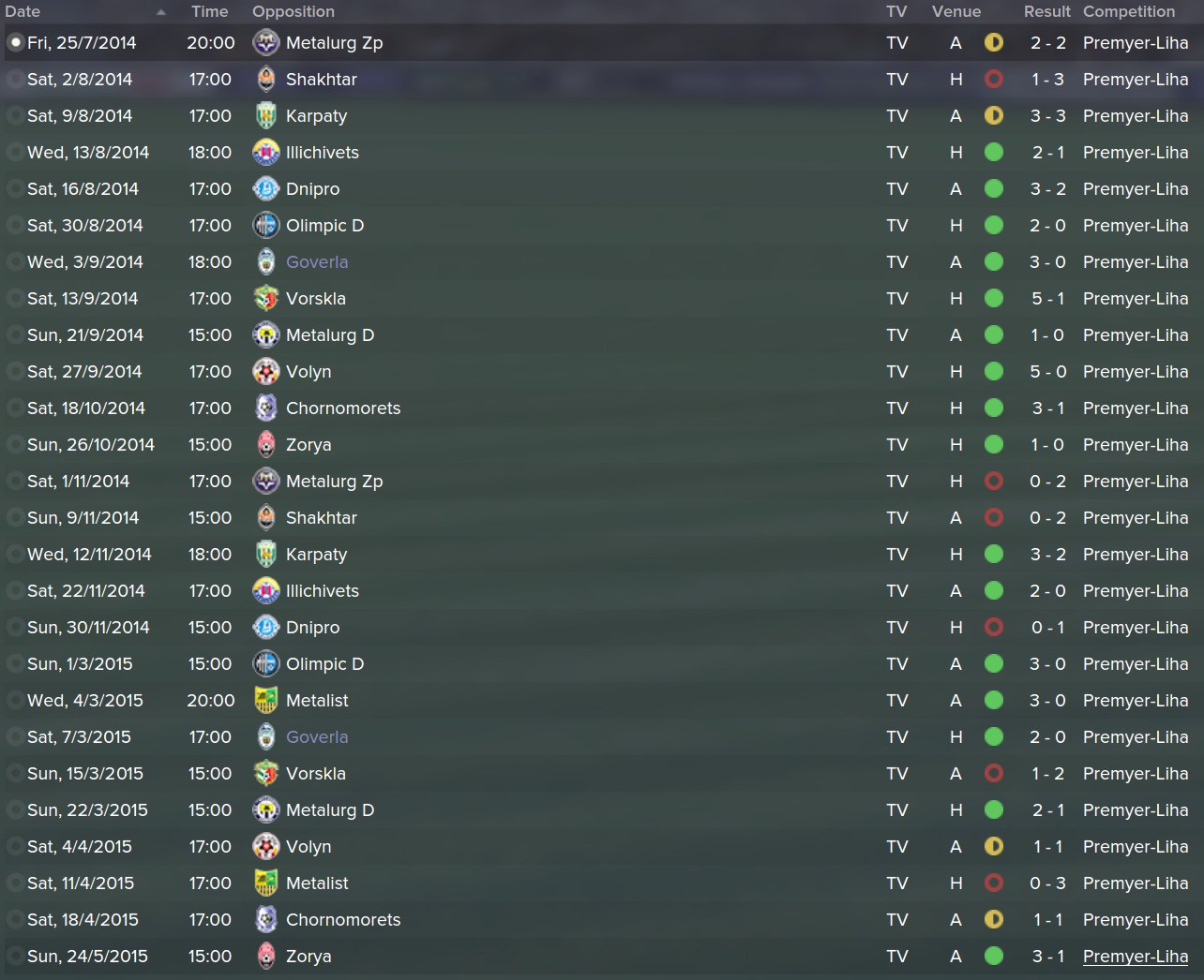 The league went all wrong for me. Dnipro and Shakhtar just don’t drop points, they each lost 3 games and I lost 6 which was very poor. We started off with 2 points from a possible 9 and from then on we were playing catch up. We could never claw back the points as Dnipro and Shakhtar just piled up the points. Our inability to break teams down really cost us in games where we went behind. Our final league results looked like this.