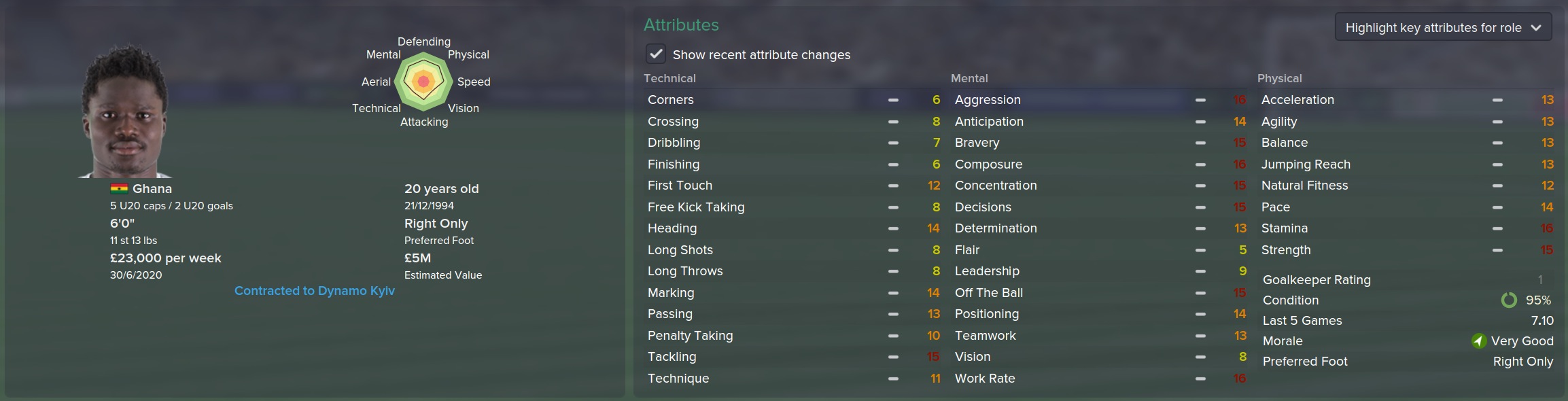 Daniel Amartey was a bit of a surprise signing for me, plenty of teams were interested, but I really wanted him, for reasons I’ll explain later, so I put a few extra thousand into his wages. We have the budget and I think it’ll be worth it long term. He is a player that has the ability to be very good in a number of positions. He’s a good central defender, defensive midfielder and ball winning midfielder. At 20, again he has room to improve. He’s not going to play many defence splitting passes and again, technically he’s not amazing, but those mental stats convinced me he could do well. His versatility is definitely an asset for us.