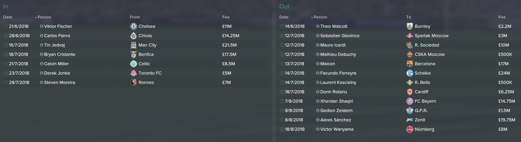 Fierro and Fischer arrived just before I did, I was happy with both of those signings. Likewise, Walcott’s departure was not my decision, but one that I supported. I’ll not go into the thinking behind all of the departures, but a lot of it was financially based decision making and trying to get the age of the squad down. I don’t have time for sentiment when it comes to older players. Even some signings from the previous regime were shown the door. Mertesacker also left, but for free to get him off the wage bill, £95k a week and I had little plans to play him. A lot of money raised and a few quid in the bank.