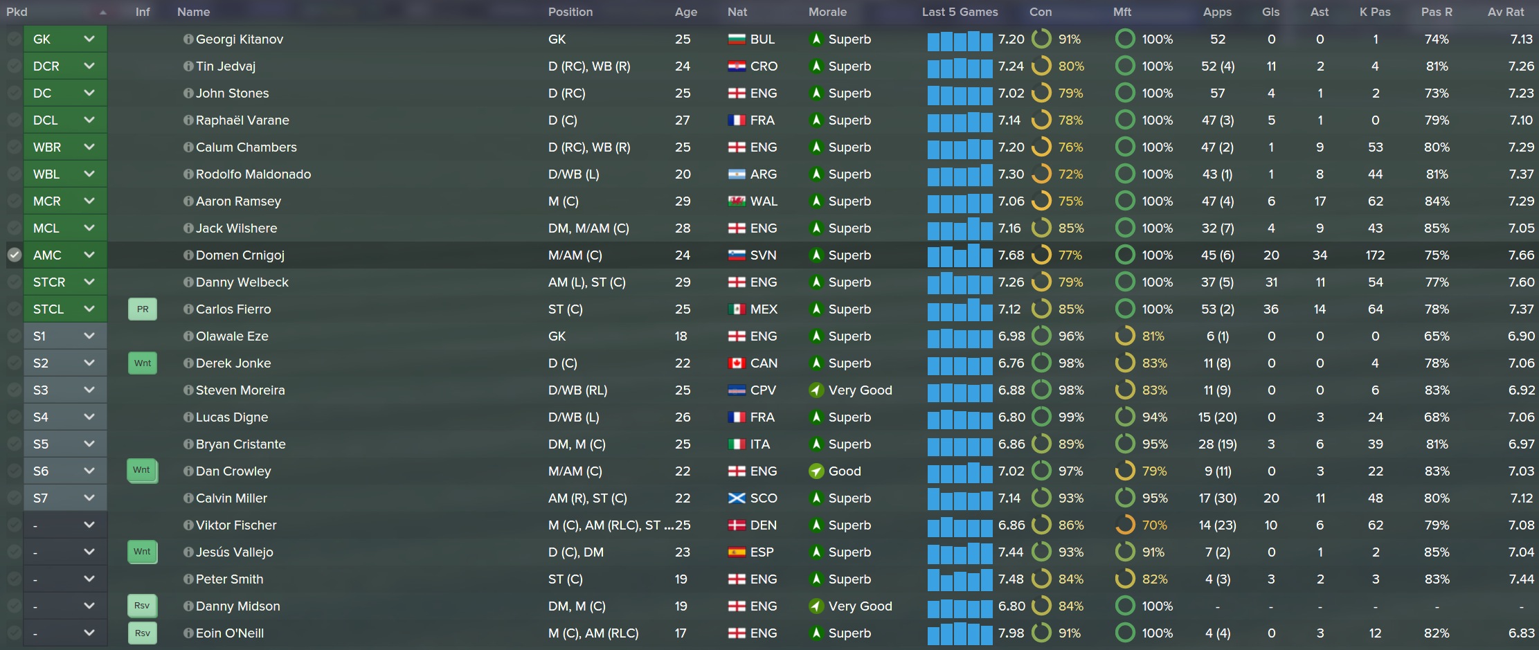 The players I was relying on really stepped up and won us games, almost single handedly at times. Domen Crnigoj, Carlos Fierro and Danny Welbeck were brilliant. Crnigoj had an amazing season with 20 goals and 34 assists. Fierro was a goal machine at times and grabbed 36 goals. Welbeck came good in the second half of the season a got himself 31 goals. A mention should go to Tin Jedvaj who managed 11 goals from central defence. Love a defender who can find the net.