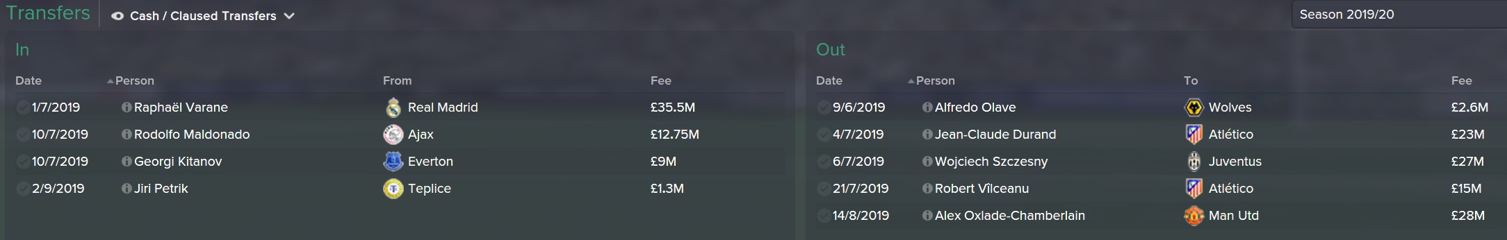 Raphael Varane was my number one target in the summer. I needed him more than he needed me, but I got him. £35.5m to get prize him away from Real Madrid. Buying a goalkeeper was almost impossible. Nobody wanted to part with their number one. I eventually settled for Georgi Kitanov from Everton. He wasn’t even that great, but I couldn’t be fussy. Maldonado was signed as a future prospect, but ended up playing as first choice ahead of Digne. I spent £59.3m, but I’d made a considerable transfer profit.