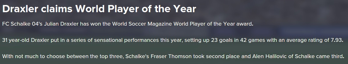 Surprisingly, when it came to player awards, Julian Draxler won World Player of the Year and the Ballon D’or again. I didn’t even think he had merited such awards. was quite happy to see Fraser Thomson and Alen Halilovic pick up second and third in both awards. Goal machine, Gökmen Kocabiyik picked up the European Golden Boy award.