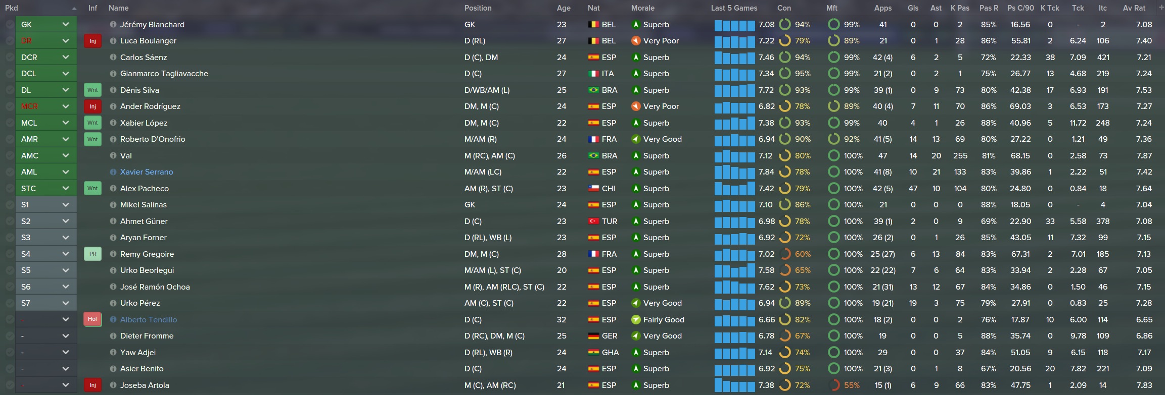 Player performances were also great. Pacheco was a superstar, banging in 47 goals in 47 appearances. My attacking midfield trio also helped themselves to 38 goals between them. Val and Serrano (on loan from Barcelona for another season after this one) also helped out closing down opposing players by averaging over 2 tackles a game each.