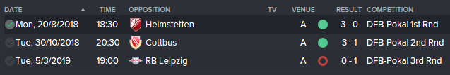 Winning the Pokal last season was our first silverware in this save. It wasn’t a priority this season as I wanted to improved performances in the league and Champions League. Victories over Heimstetten (3-0) and Cottbus (3-1) came before a 1-0 defeat at recently relegated RB Leipzig ended our chances of retaining the cup.