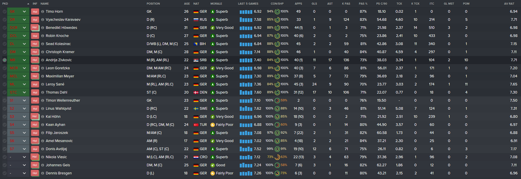 Sané scored 24 from the left wing and Zivkovic nabbed himself 11 from the opposite side. My strikers finished the season with 29 goals between them, so I’m hoping for an improvement on that next season.