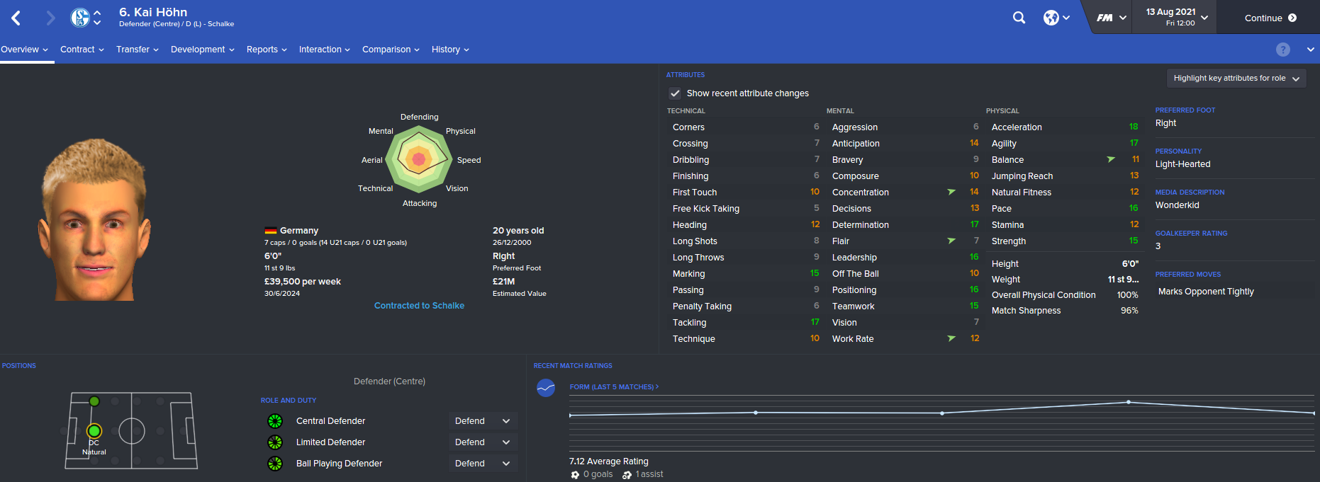 Kai Höhn is a player that I’m still developing. He’s a very quick central defender who is good in the tackle and can read the game well. He’s now 20 years old and has 7 senior caps for Germany. He’s linked up really well with Tah to form a strong partnership.