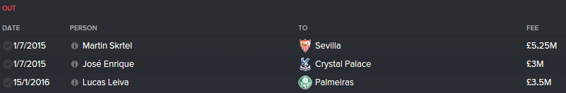 Outgoings are always the same for me at Liverpool. Enrique, Skrtel and Lucas. Three players I never use that make big money. Skrtel and Lucas are always well overvalued for some reason. I can never get anywhere near their value in the game, but I’m quite happy to take what I can get. Enrique always seems to get me around £3m, despite being rubbish and only having a year of his contract left. Toure also left on a free transfer. I’ve taken this screenshot from the end of the season.