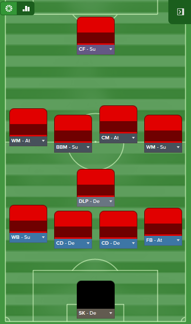DM- I guess Gerrard was our pivot. He played a bit like a half back but not at the same time. I suppose a lot of people would choose Regista and sacrifice defensive stability, but I’m not that guy. DLP/D will keep position, play decent passes and rarely go forward to support attacks. It creates a nice little defensive triangle at times and he’ll drop into the defensive line to pickup the ball. The Half Back role spreads the two defenders too wide I find, so this should work just as well.
