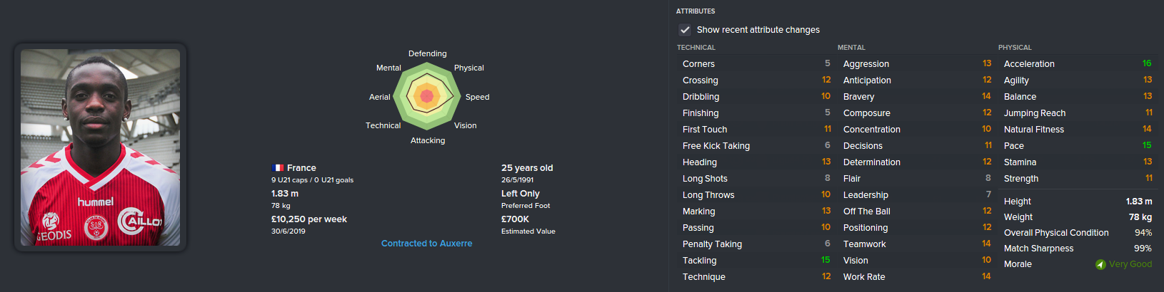 My priorities were centre back, left back, attacking midfielder and a striker. Defence was the big one as I thought we switched off easily last season. I have a set of attributes that I always look for in centre backs. Anticipation/Concentration/Positioning/Strength/Jumping. I need all of those to be of a good level. Everybody has their own preferences. Some like to focus on the main blue highlighted attributes, that’s cool, but these are mine. I found a few centre backs, but this guy fitted the bill and was well within budget. Josué (CB) was my most expensive signing of the summer at £800k.