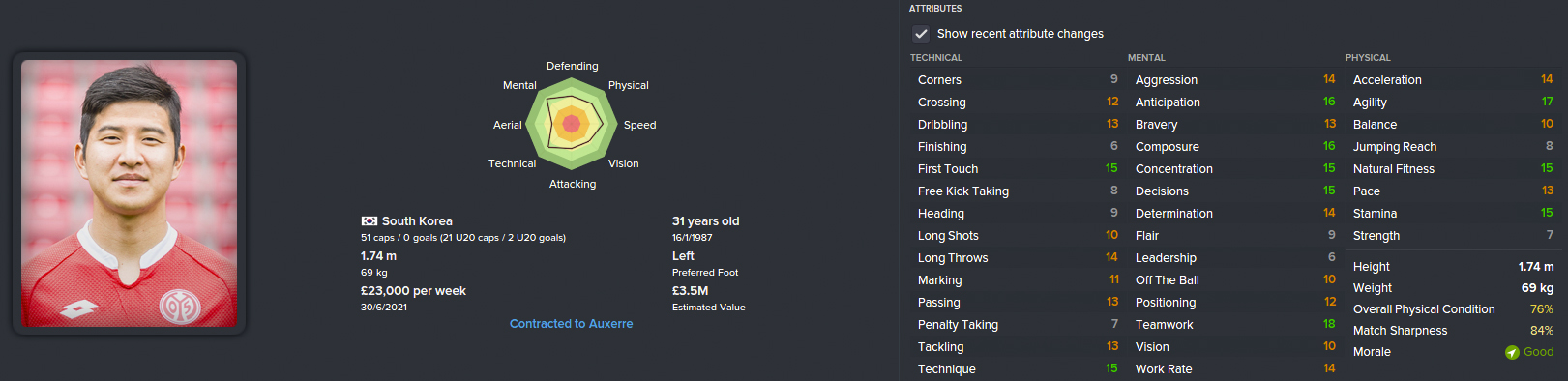 A left back was first order of business. I narrowed it down to two players. Park Joo-Ho from Dortmund or Gaël Clichy from Man City. The decision came down to their mental ability and Joo-Ho won. They were both fit and pretty similar in terms of attributes for the role they’d be filling. Nice little free signing to get the ball rolling.
