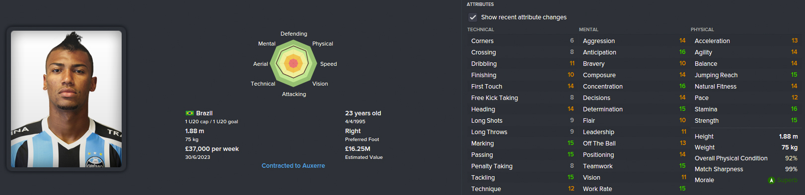 I scoured the market and I narrowed down my shortlist. I was really close to signing Marko Grujic from Liverpool, but his preferred moves scared me somewhat, so I cancelled that deal. I wanted Gonalons from Lyon, but his wages scared me a hell of a lot. There were others, but I settled on this guy. Walace from Gremio for £10.5m. He’ll be playing as a central midfielder, defend in the middle of my midfield trio.