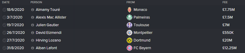Touré was signed as a replacement for Aguilar and the earlier departed Agobian. Lozano/Gautier came in to replace the outgoing Markovic. Mac Allister replaced Gauld. Lafont was a goalkeeper I really wanted to sign earlier in the save, but Bayern were wanting far too much. I had money this time when I saw him on the transfer list and snapped him up. Eizmendi was joining our youth setup.