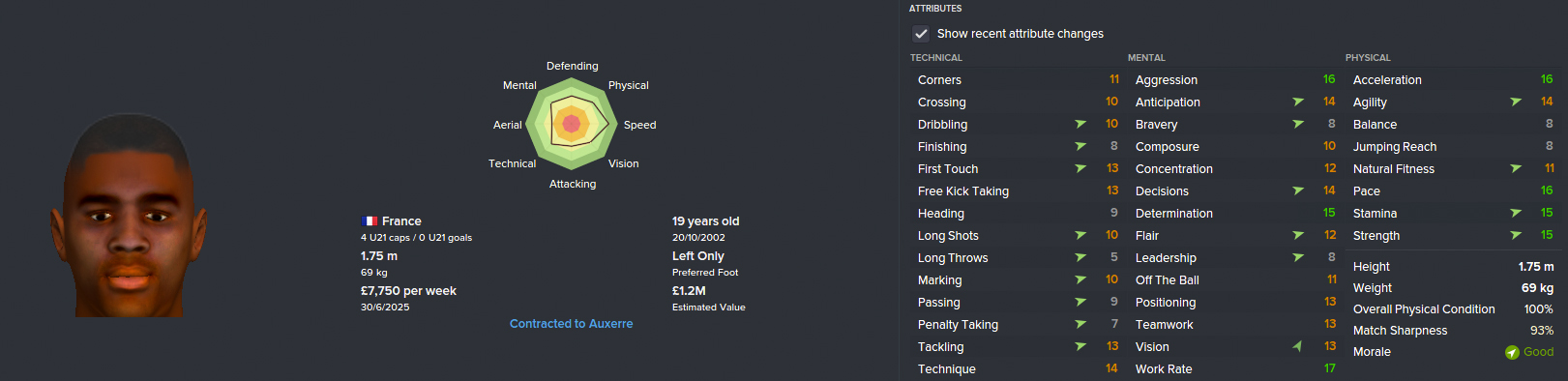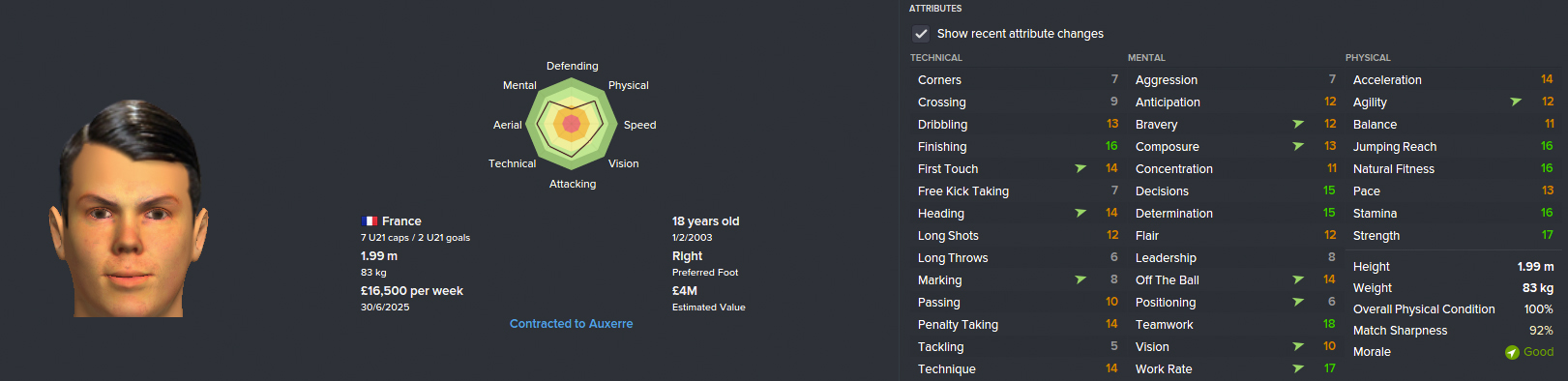 Showcasing young hopefuls would be pointless if I didn’t have an exciting striker to look at, right? This is Fabien Raynaud, an 18 year old giant that’s currently forcing his way into the first team. He’s described as a target man, but I’m trying hard to expand his game right now. Another one who joined in 17/18, must’ve been a good year! He made his debut when he was 16 and has already featured in 50 league games, scoring 16 times.