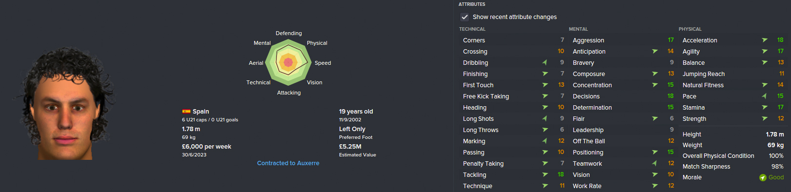 The first lad is Albert Prol, a 19 year old left back from Spain(although he has dual nationality). He joined the youth setup in 2017/18 and made his debut the following season. He’s really made great progress in his development and his physical and mental attributes are superb. I suspect one of the big team will be sniffing around him soon.