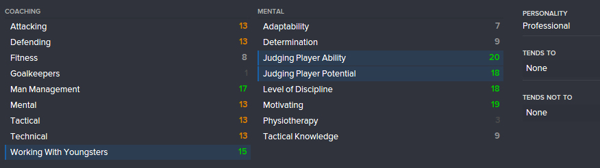 For a long time, I never ever took the personality of this staff member, or any staff member for that fact, into consideration. I was blissfully unaware/ignorant about how it could affect youth players joining the team. When you get your youth intake, it usually says “X player has taken on a similar personality to X member of staff” If you look at Mr Cannon above, he has a Balanced personality, which is a pretty neutral personality type. Ideally, you want players to have some of the better personality types, like Professional, Resolute, Ambitious etc. Players with these types of personalities will apply themselves more in training and I’ve found that further down the line, they’re less likely to get mad if they’re out of the team.