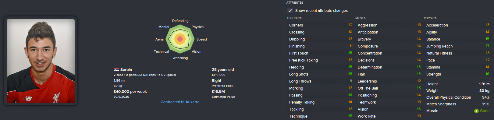 In January, I made two signings. Marko Grujic was a player I was tracking for a few years. I talked myself out of signing him a couple of times, but I really needed some experience in midfield. He can fill either the deep lying playmaker or box to box role with ease. With his personality type and his age, he’s also a good tutoring option for the young guns coming through. He did cost me £10m, which annoyed me, as if I’d bought him in the summer, I could have bought him for £5m.
