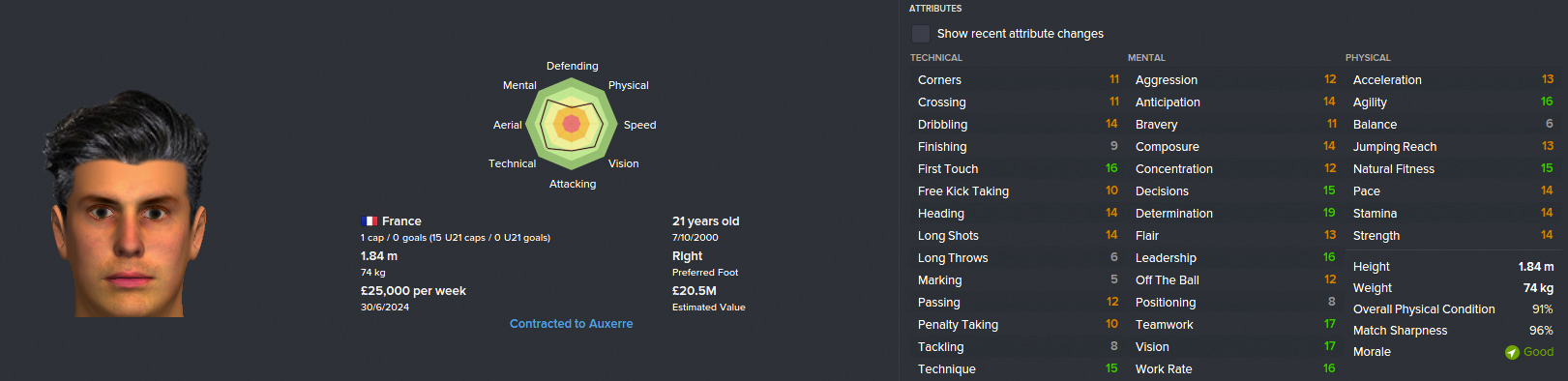 First up was Fikret Köksal from Rennes for £17m. My biggest signing, but definitely a good French youngster. He’s to play on the left side of my midfield as a Wide Playmaker. When he joined, he wasn’t very suited to that role, but with training, he’s come along nicely.