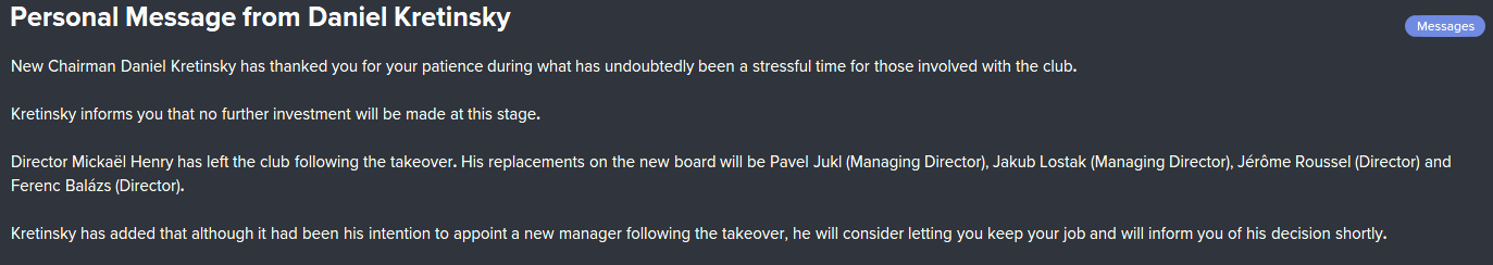 For the past couple of seasons, the owner/chairman has been looking to sell the club. There had been a few offers and they failed. However, towards the end of the season, Daniel Kretinsky made an offer for the club and after several stories popped up informing me that a deal was near collapse, the chairman released a statement saying things were on track. Rumours came out that he planned to replace me with Laurent Blanc. The deal eventually went through.