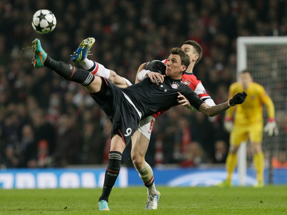 Bayern’s Mario Mandzukic of Croatia, left, and Arsenal’s Laurent Koscielny challenge for the ball during a Champions League, round of 16, first leg soccer match between Arsenal and Bayern Munich at Arsenal’s Emirates stadium in London, Tuesday, Feb. 19, 2013.(AP Photo/Alastair Grant)
