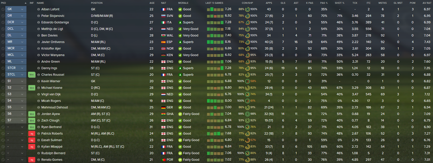 The new signings did well, Patrick Roberts probably being the pick of the bunch considering I paid nothing for him. Matthija de Ligt had a good season. Renato Gomes was initially signed as a backup option to Wanyama, but as the season progressed, he took his spot in the first team. Lafont did ok in his first season, but I always find it takes a new goalkeeper a while to settle into their new surroundings.