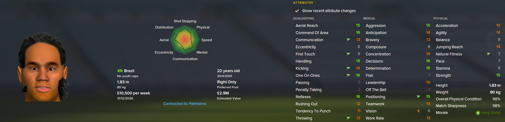 After the issue with Aguerre wanting to leave, finding a similarly attributed goalkeeper was a bit of a challenge, especially if they were going to be Brazilian. Júlio was a young keeper I spotted during the early stage of my search and he proved to be the best choice. He was my most expensive signing at £4m, but he’s had a full season of first team games and is only 20 years old. Lots of room to grow as well. Not in height though, he’s not the tallest goalkeeper, something I’ve only just noticed.