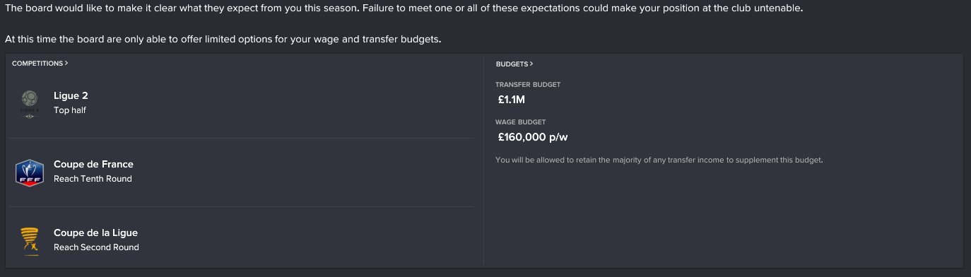 The board have given us very achievable goals for this season. Not much explaining to do here, hit my goals and I’m safe, otherwise I’m in trouble.