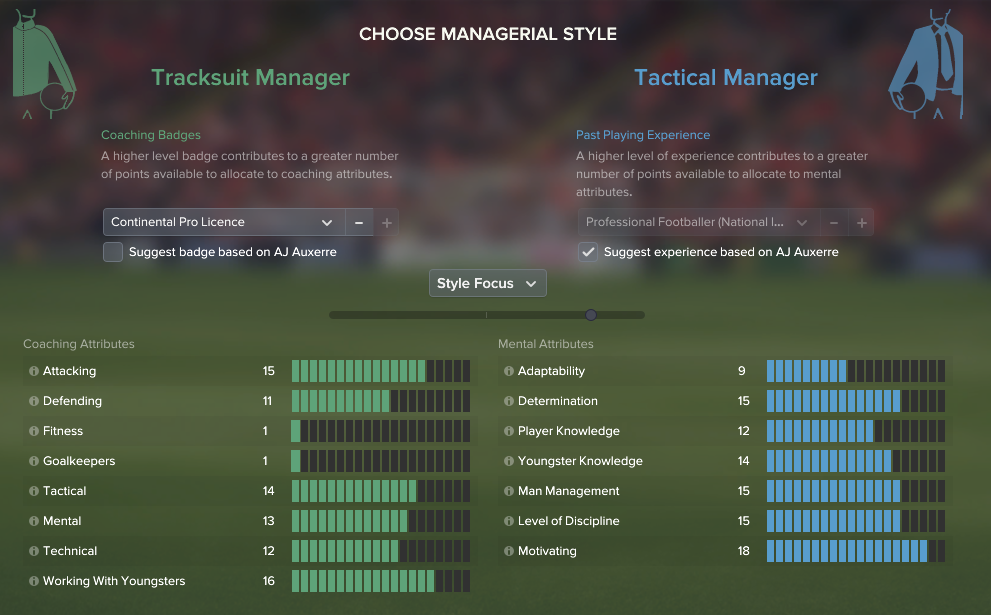I toyed with the idea of using a former French player as my manager, however, I wanted all the glory for myself. I’ve not given my manager “former global superstar” status, although on reflection, I wish I’d given him a better rating for his Technical attribute. I’ve put more of a focus on the Tactical (mental) side of the spectrum as the Tracksuit side develops as you get progress through the game. I’ve been playing FM for 20 years, I think as far as the game goes, I’ve earned a Continental Pro License.