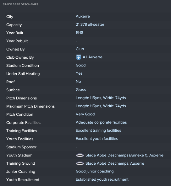 The club have a pretty decent setup when it comes to facilities. It’s not out of this world and will need some work, but for a team in Ligue 2, it’s very good. The main things to focus on are obviously the Youth and Training Facilities which are both at excellent, which if I remember correctly, is the second highest level available in the game.