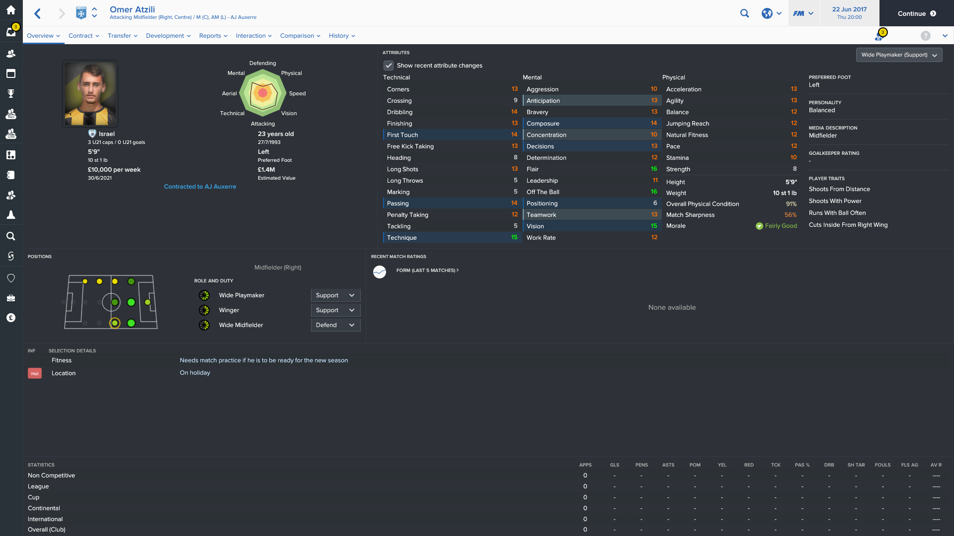 My hunt for a central defender continued and scouting missions to various far flung parts of Africa had begun. As I waited on some reports coming back, my attention was turned towards midfielder Omer Atzili of Granada. He was on the transfer list for £400k. Looking at the attributes he offered, it was a no brainer. I know I needed centre backs, but this guy looked great. A deal was drawn up and the rest is history. His shoots from distance PPM is a drawback, but if I can get him to focus on his playmaking, then I’ve got myself a bargain.