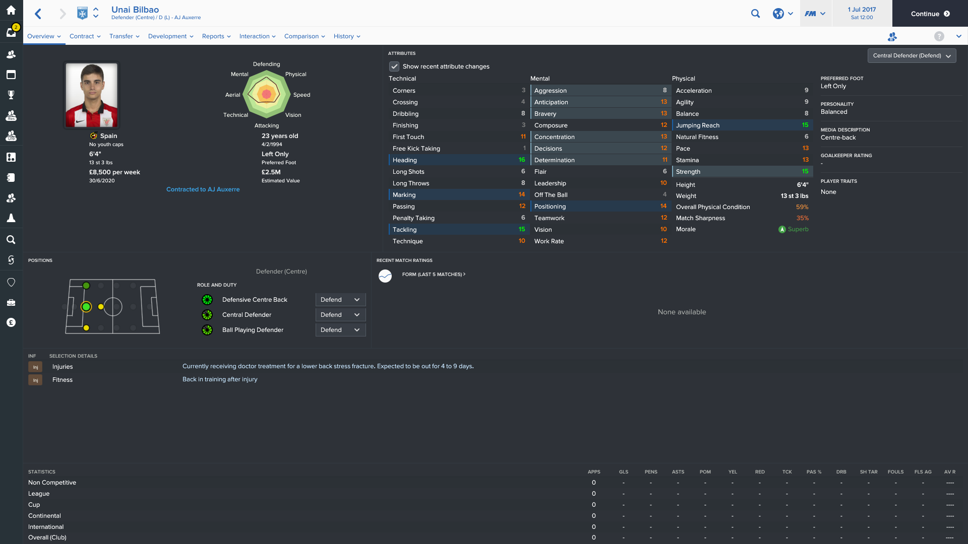 My first signing was Unai Bilbao from Athletic Bilbao for free. He’s a strapping young lad who’s great in the air and can read the game pretty well. The wages were a bit steep, but I suppose that happens when you don’t pay a fee. I tied this deal up at the start of June but he didn’t join until his contract ended.