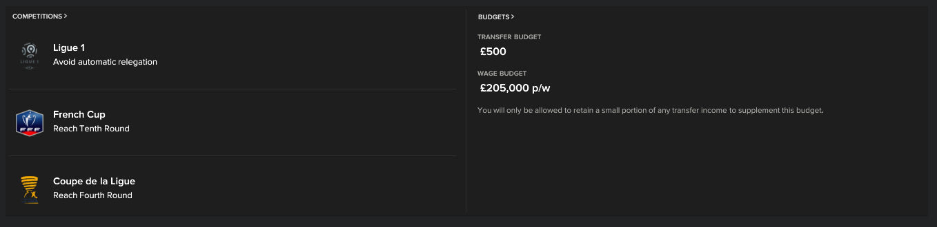The goal will ultimately be to stay up. The board have tasked me with avoiding automatic relegation, so anything above 18th is good for us. I’m pretty confident we’ll avoid relegation. I’m aiming for mid-table. Anywhere around 12th would be a great season I think.