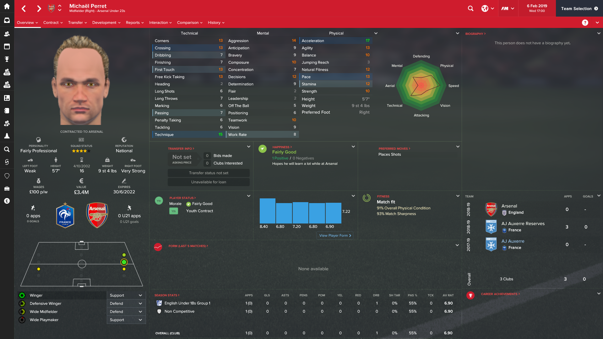 After some internal debate, I decided I’d go for it. I looked at the players that I was having bids on and elected to sell one. I chose Michaël Perret. He’s a 16 year old right winger, 5 star potential with good technique and acceleration. It was probably the position that I’d likely get an abundance of players playing in over the years, so I can sell this guy now and another one will likely come along in a season or two.