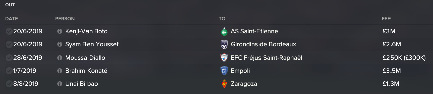 Boto wasn’t happy with his amount of game time with the young Thiebaut taking on first team duties. Youssef said that I broke a promise that I allegedly made, but I couldn’t find any note of a promise. I decided to cash in and move him on. Diallo and Konate weren’t going to get any game time this year as I had another youngster called Anis Nefzi that I planned to bring into the first team and give game time to. A nice little pot of money was earned to boost the coffers a wee bit.