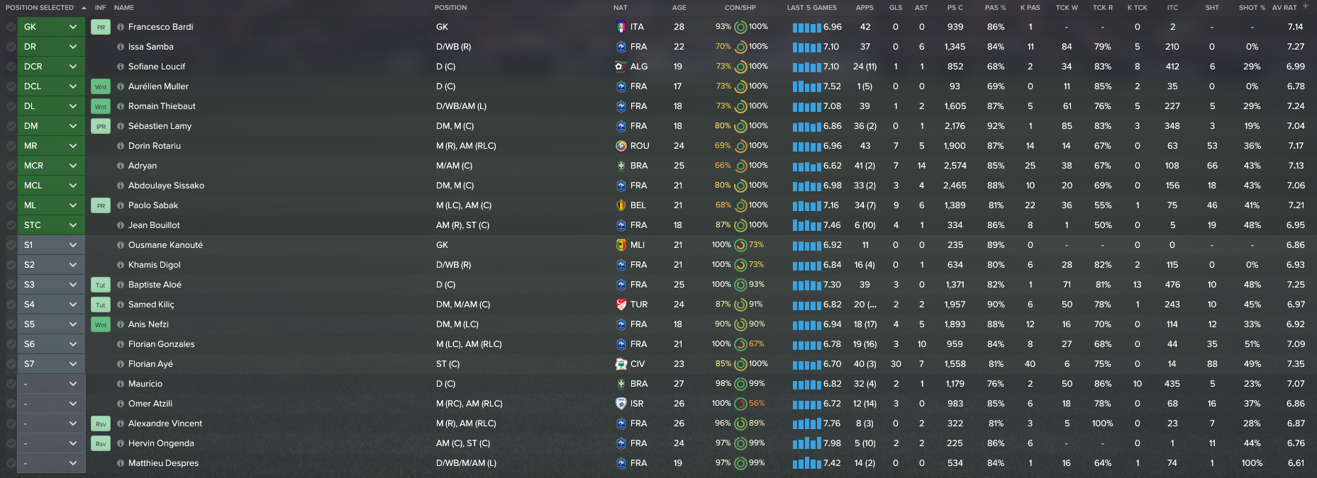 We blooded several youngsters and continued working with the ones already in the team. Thiebaut and Lamy were well established in the first team as both made well over 30 appearances each, despite both only being 18 years old. There was plenty of game time for Loucif, Despres and Nefzi. Muller and Bouillot also got some first team games under their belt too.