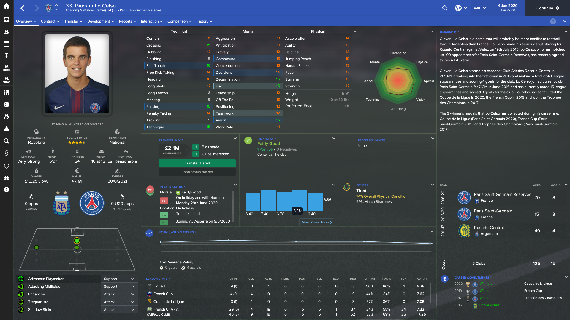 The first man to arrive was Giovani Lo Celso from PSG. I’d identified him as a signing target in January. His attributes were very appealing as well as his personality type. He also found himself unwanted at PSG and on the transfer list. For £2.1m, I could hardly say no. He’ll fit in as my CM/A and I’m hoping his passing and creativity will benefit us.