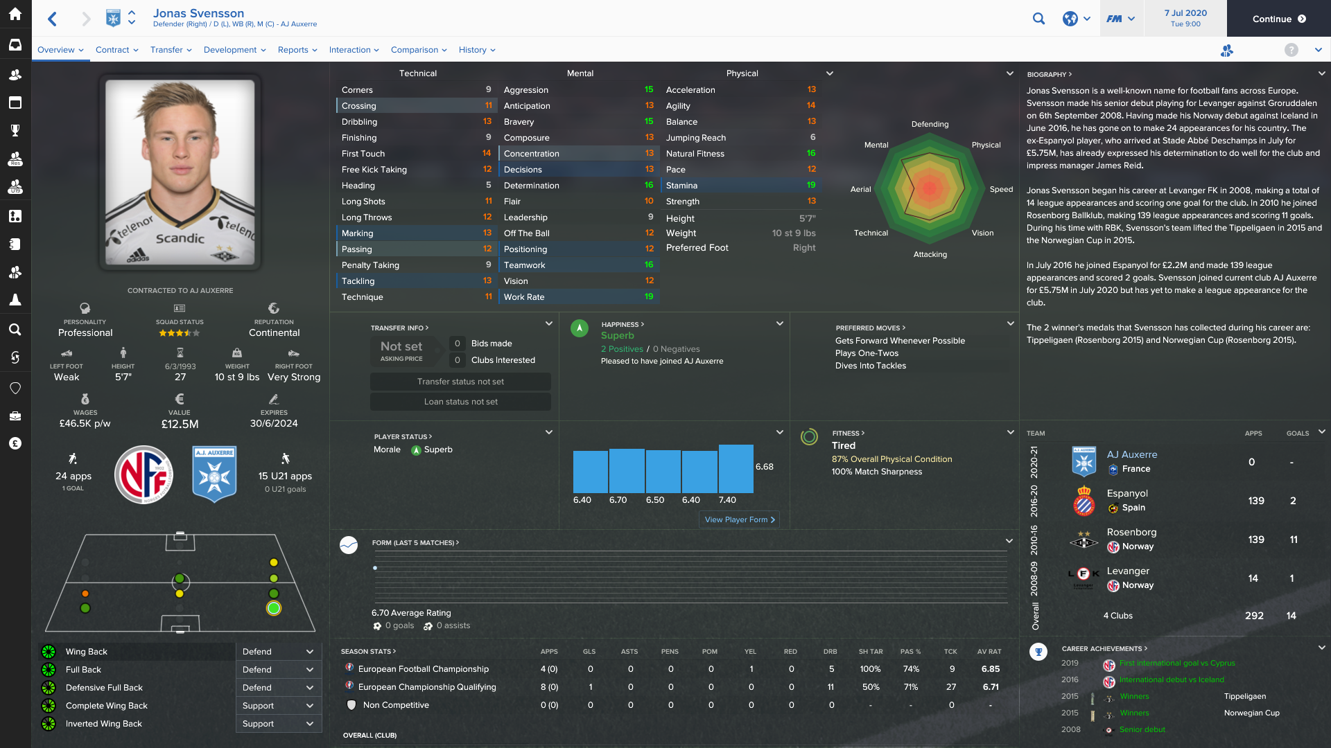 Right back was position I’d been considering improving for a couple of years. Samba is a decent player, but he’s always looked like a weak link in my backline. Finding a replacement that fitted my profile was difficult and I had to break my transfer record to get him in. Jonas Svensson was my man. He was a bit older than what I’d usually look to sign, but I made the exception due to his professional personality which would help with tutoring the young players I have coming through. He cost me £5.75m rising to £6.25m when he arrived from Espanyol. His ability to play on the left hand side of defence was a nice touch as well.