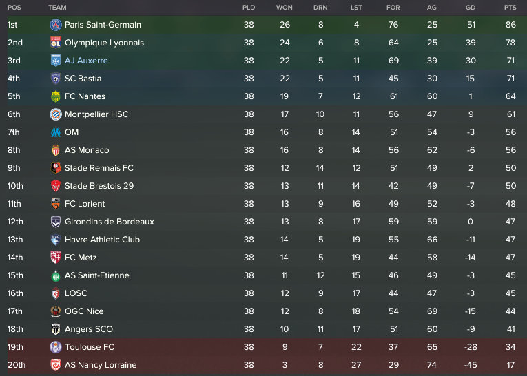 A rather successful season, despite our inconsistent performances at times. The Champions League defeats really dented our confidence in the league games and a gift from Toulouse saw us finish third again. The French Cup victory was glorious was another big step forward.