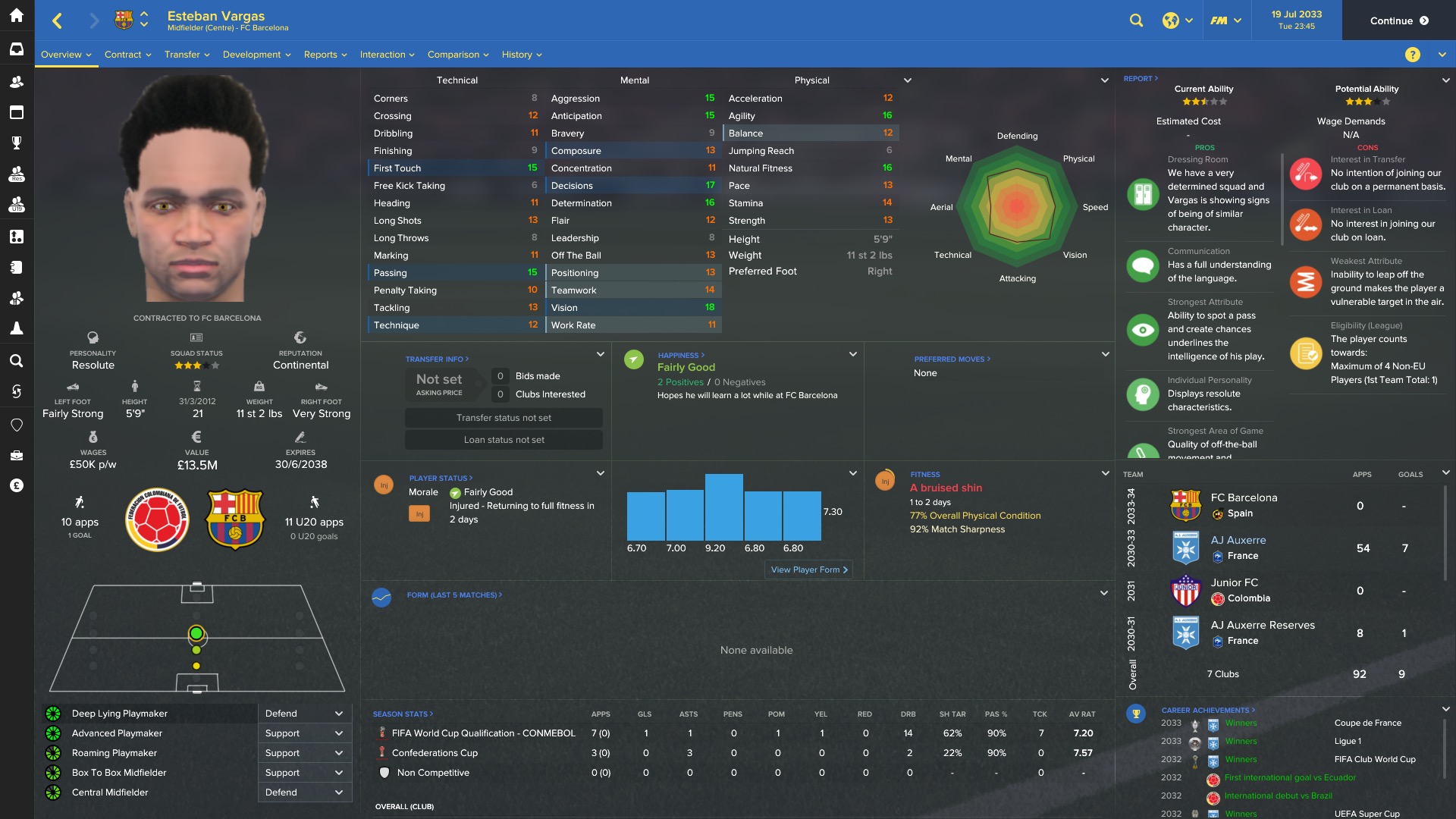 Esteban Vargas joined Barcelona for £18m. A good player, but not one to set the world alight. Played a good number of games for me, but I had my eye on some new blood. His value was good so shifting him at this stage made good sense financially.