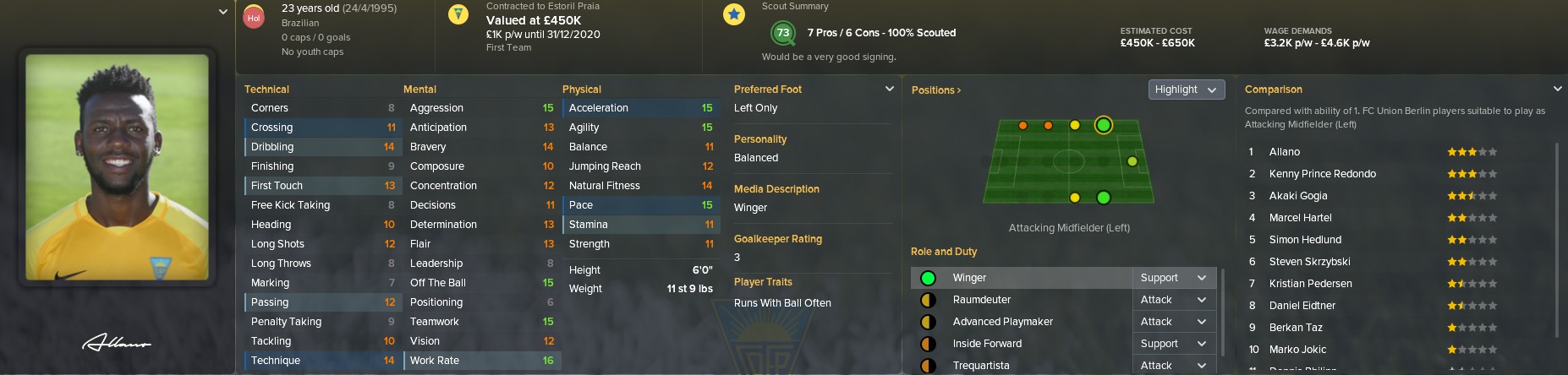 No, I’m going for Allano, he looks like a better winger to me, his pace, off the ball and slightly better mental attributes make him a more attractive proposition. We’ve already seen with Redondo that pace can make up for any shortcomings, so with the better mentals, I think I’ll have a good player. £600k offer has been made along with a contract offering £5k p/w. Done deal!