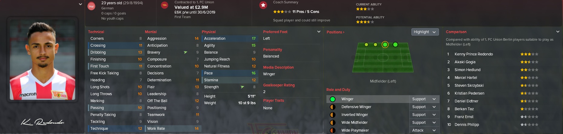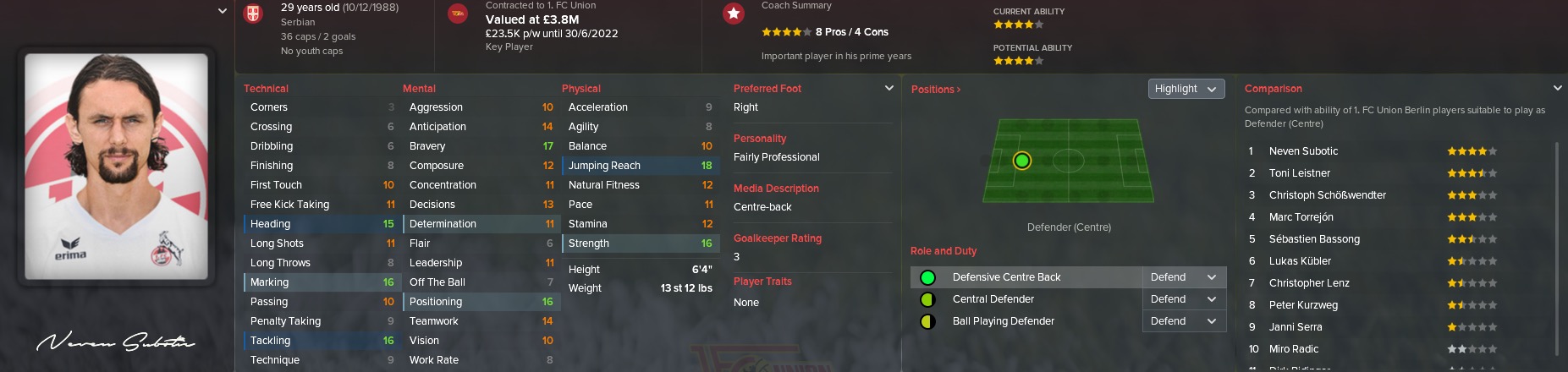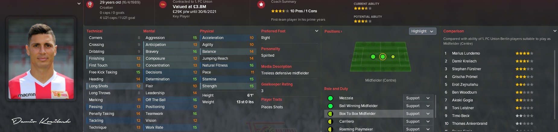 So with a tactic decided, I could now make plans for the players I require (and no longer require) for the season ahead. I like players who work hard for the team and I think that works quite well with what Union Berlin fans would like to see, passion, determination and players that will run for 90+ minutes. I’ll not be able to get all of that in one transfer window, but I’ll try my best to sign players who will fit that description. As the save progresses, I’ll be focussing more on specific player types.
