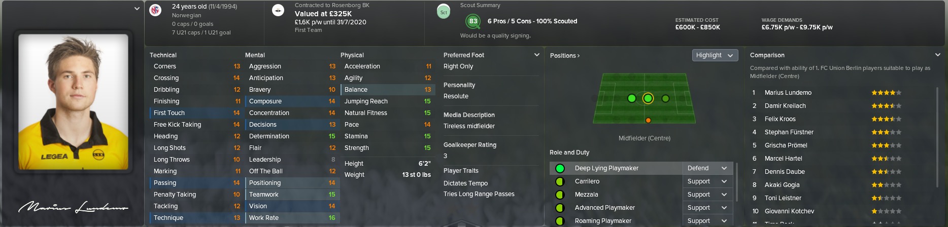 You’ll probably look at the above and say “they’re not natural box to box players” but that’s perfectly ok. They play this role and carry it out quite capably. Both are good players who will improve the side, but I was already leaning towards Lundemo. He’s younger, technically better and a more rounded player. Overall he is a much better fit for the role I want him to fulfil. Their wages would be about the same but Lundemo is likely to be the cheaper player.