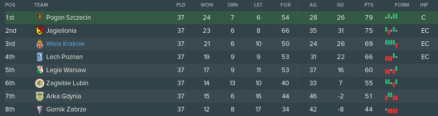 For those of you who don’t know about the Ekstraklasa, it’s a 16 team league where you play each team twice and then it splits into a Championship Group and Relegation Group. You play each team in your group once.