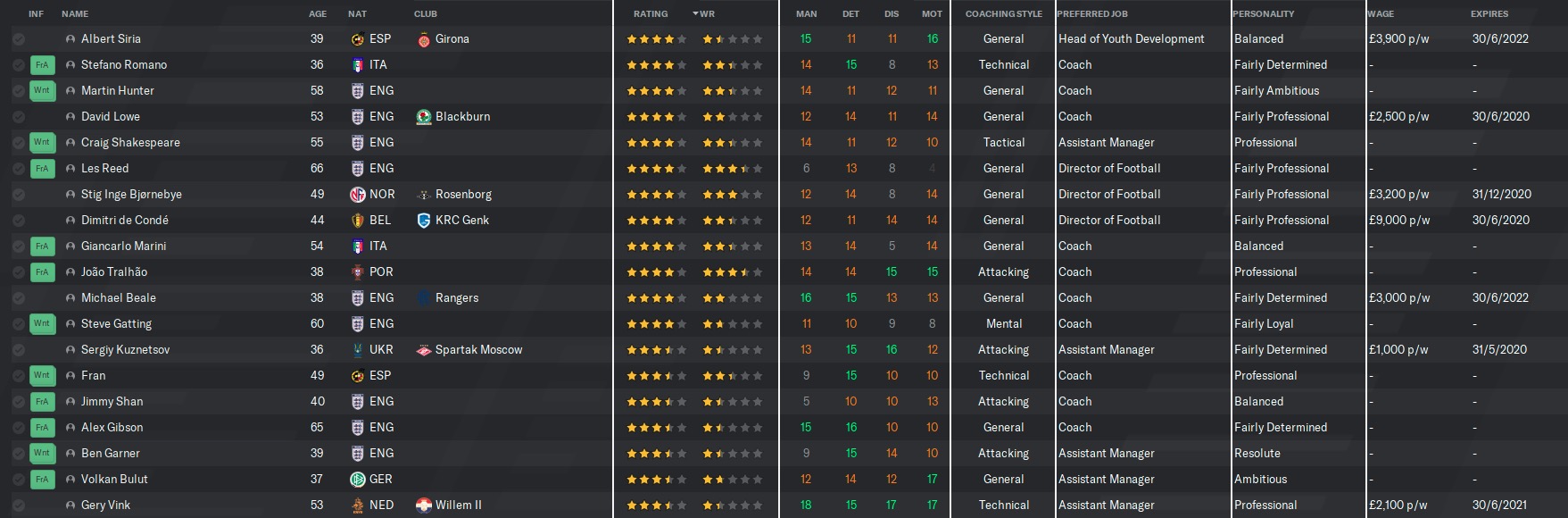 Taking over a club usually means that people will leave the club. Players are usually most at risk, but a new manager usually has his own coaching team in mind. I rarely have a backroom setup in mind when I join a club, but I know the characteristics I want them to possess.