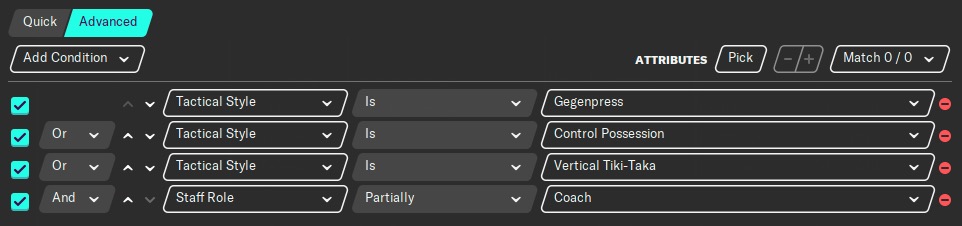 This is where search views can speed things up. When I go to search for my coaching staff, I apply a filter that roughly works in with the type of football I’d like to play. I want my teams to press and control games. I’ve included three styles of play that are closely linked to that, I could add Tiki-Taka, but I’ve just gone with these three. You can add in preferred formations as well if you like, I try not to let that bog me down too much as formations are just numbers, stylistically, you want to be going down the same path. I don’t see too much difference between a 4231 and 433 in certain phases of the game, but I’d maybe skip over a coach who prefers a back 3 or 5, that’s my preference though.