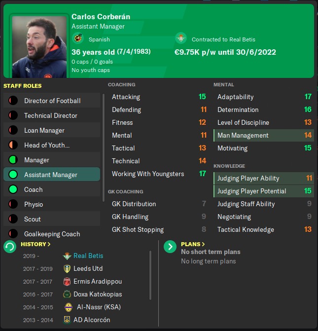 It was surprisingly difficult to find an assistant manager that fitted my tactical preferences. Corberán is a good versatile coach with a lot of experience who will hopefully help us in the short-term until I can find a better suited assistant. Being Spanish helped him over the alternatives I had in mind. His wages are quite expensive, so I may have to wait until his contract ends before replacing him.