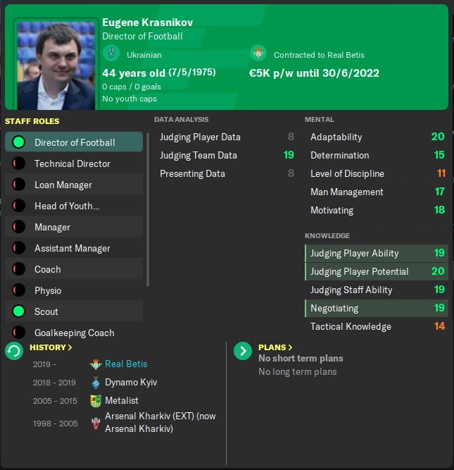 I think it’s pretty clear to see why I snapped up Eugene Krasnikov, he has outstanding attributes for a Director of Football. He was the top rated DoF when I did my search. His knowledge isn’t the best, but he’s not here to scout players, he’s here to negotiate and to oversee the scouting department. He’ll hopefully link up well with my new Chief Scout, Keke Durán. I imagine he will be here for the long-term, it will be very difficult to find a better suited DoF.