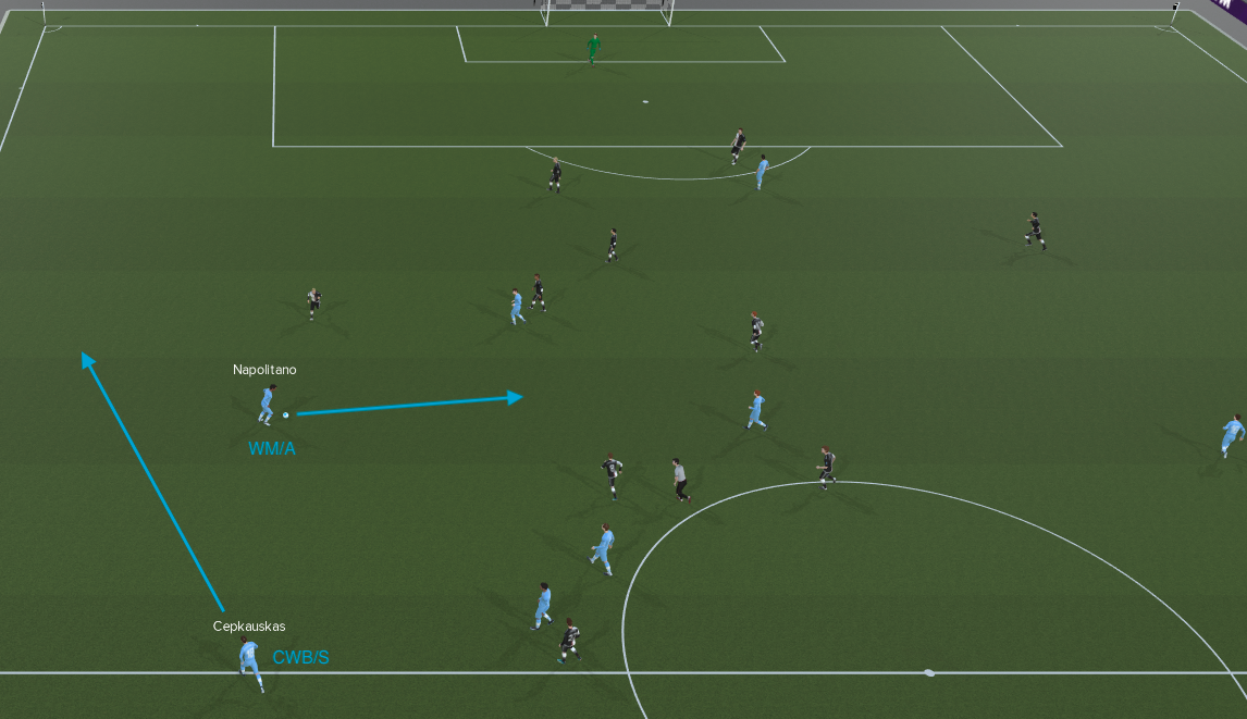 As the move progresses, Cepkauskas ends up one-on-one against the opposition right back and makes an assist. He isn’t deep, but he isn’t on the byline either. He has an abundance of options to cross to and a couple of passes if he so wishes.